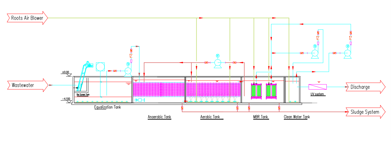 Anaerobic tank, the main function is removed the phosphorus and bacteria, that low down the COD. The suggest tank size is 8—12 times volume of 1-hour treatment wastewater.