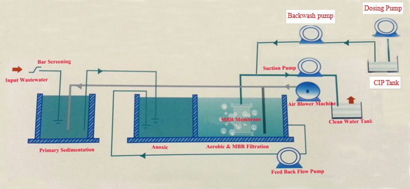 Wastewater influent——Bar Screening—-Collection water tank -—Anaerobic Tank (or septic tank) —Aerobic Tank——MBR Tank——Clean Water Tank & Sludge Tank